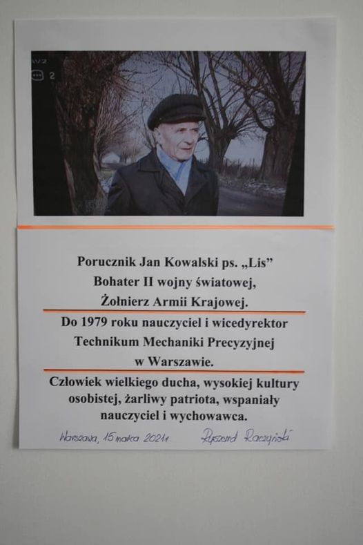 Wieloletni pedagog Ryszard Raczyński połączył stare pokolenie z młodym. W tych dniach Ryszard Raczyński dokonał w kronice szkolnej Technikum Mechaniki Precyzyjnej pamiątkowego wpisu o Janie Kowalskim, pedagogu, dyrektorze tylko przez jeden rok i wieloletnim wicedyrektorze Technikum Mechaniki Precyzyjnej w Warszawie. We wpisie p. Raczyński podkreślił patriotyzm i działalność Jana Kowalskiego, dowódcy plutonu 763  w Armii Krajowej Obwodu „Obroża”  na terenie dzisiejszej Gmina Halinów. W  latach 1965 – 1970 Ryszard Raczyński był uczniem Technikum Mechaniki Precyzyjnej w Warszawie na ul. Grochowskiej 346/348 . Jednym z jego nauczycieli był ówczesny wicedyrektor i przez jeden rok dyrektor szkoły Jan Kowalski . Ostatnio p. Ryszard odkrył, że na jego świadectwie maturalnym z 4 czerwca 1970 r. znajduje się podpis Dyrektora Jana Kowalskiego, który właśnie w latach  1969 / 1970 przez jeden rok sprawował funkcję dyrektora technikum. Po studiach na Politechnice Pan Ryszard rozpoczął pracę nauczyciela w macierzystym Technikum, gdzie wówczas Jan Kowalski pełnił znowu funkcję wicedyrektora ds. Pedagogicznych.